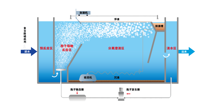 孢子轉(zhuǎn)移技術,是將混凝技術、氣浮技術與微納米孢子相結(jié)合,通過定制化藥劑、微納米氣泡與水中的磷、疏水基懸浮物發(fā)生反應,創(chuàng)新形成的一種高效物理化學處理方法。主要解決了目前常用溶氣氣浮技術在應用過程中存在的處理效率較差、表面負荷較低、處理能耗較高、應急機動性不強等問題。